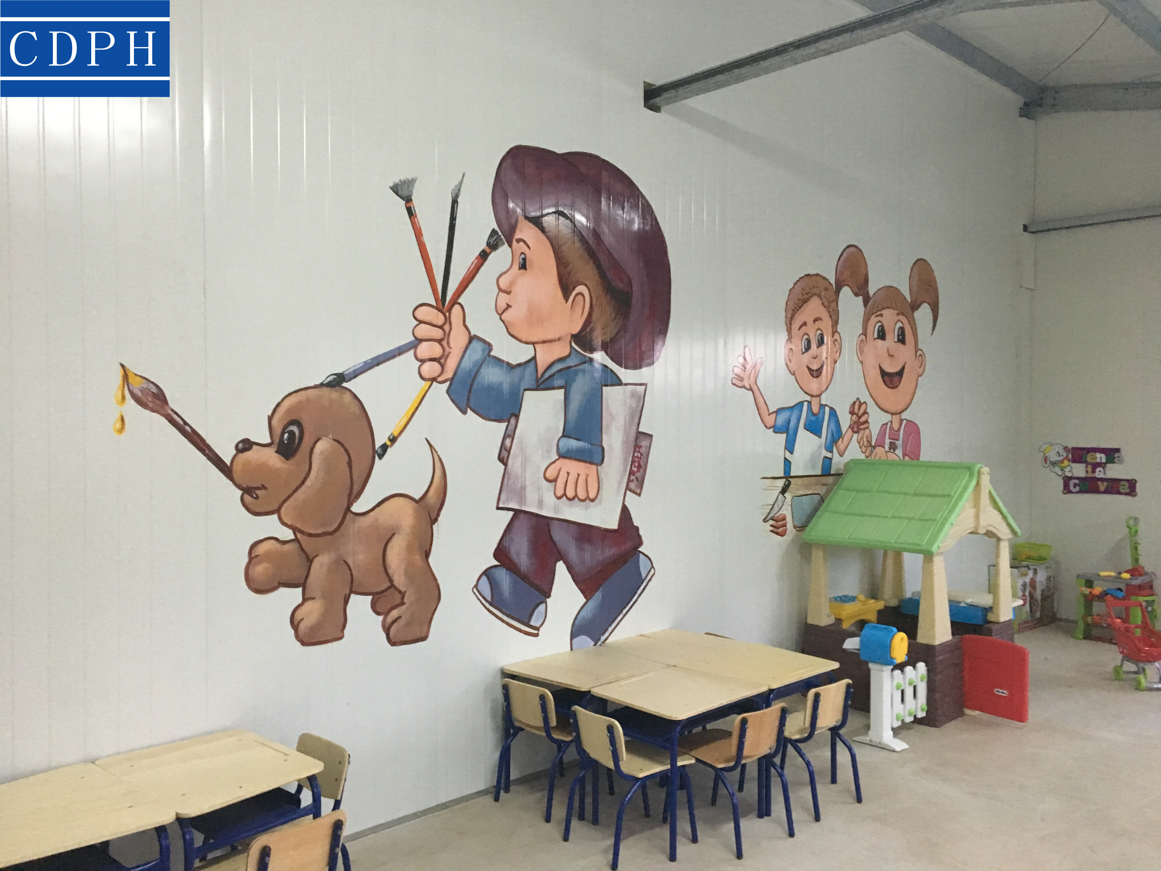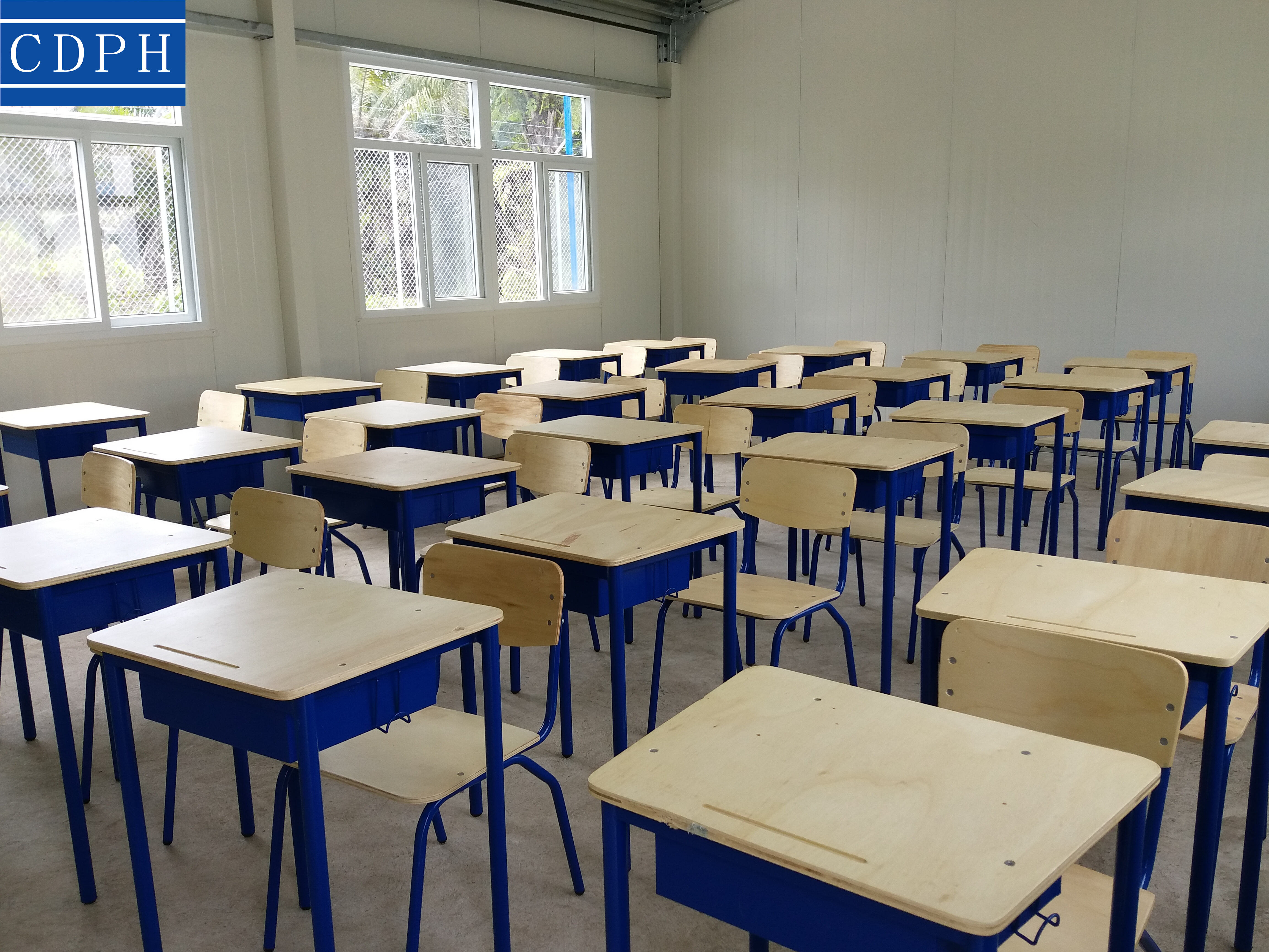 Το προκατασκευασμένο σχολικό κτίριο περιλαμβάνει χώρους διοίκησης, τουαλέτες, αποθηκευτικούς χώρους, τυπικές αίθουσες διδασκαλίας και εξειδικευμένες αίθουσες , παιδική χαρά, μπάνιο κ.λπ.